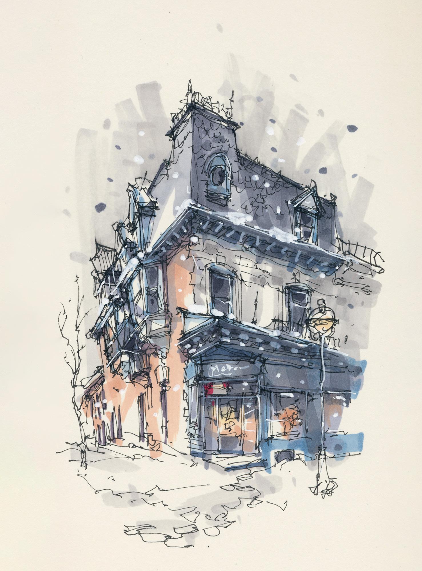 Over the years, I’ve become a ruthless perfectionist, so I was very hesitant to pick up sketching again after thirty years. In the summer of 2016, I decided to give it another shot. I bought some random materials (alcohol based color markers and black fineliners and a sketchbook). To make myself more disciplined, I decided to make at least one sketch every day. I didn’t really have a specific subject in mind, but slowly, my love for architecture started to shine through in my work.
