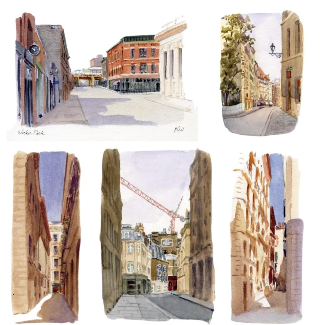 This workshop explores the dynamic compositions that can be created when looking down streets and alleyways. We are seeking to simplify the complex perspective, and demystify the process of adding detail on buildings viewed at a harsh angle.