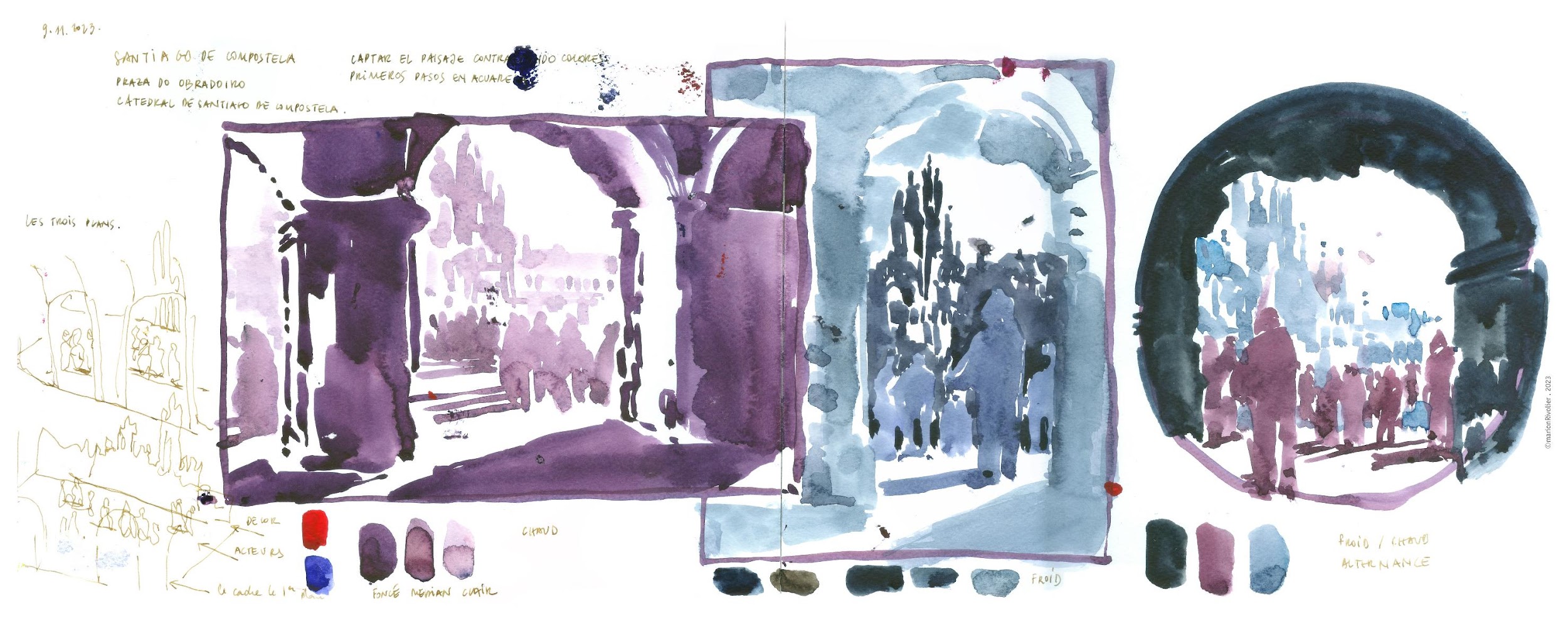 She loves to explore spaces through drawing to understand their essence and significance, a practice she shares through her watercolor workshops held regularly in France and abroad.